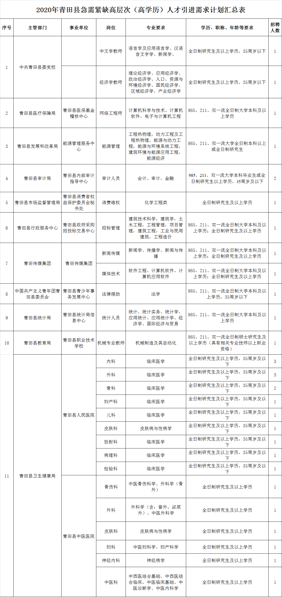 2.引进岗位:详见2020年青田县急需紧缺高层次(高学历)人才引进需求表(附件)。