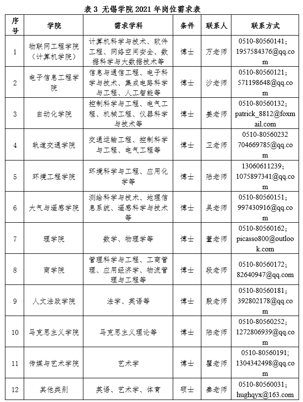 2.应聘骨干师资、优秀师资者请联系各二级学院,联系方式详见表3岗位需求表。
