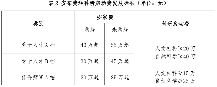 2.可购买无锡市优惠商品房一套(均价约7500元/平米,有产权)。购房者需连续完成两个聘期(每个聘期4年,未服务满2个聘期需按未完成的服务年限等比例补缴购房差价),可享受学校提供的租房补贴1000元/月,发放期1年;未购房者需完成首个聘期,可享受学院提供的租房补贴1000元/月,发放3年。安家费和科研启动经费相关标准见表2。