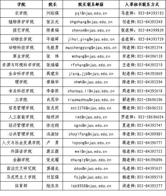 (3)应聘方式:发送简历至相关学院院长邮箱(见附表)或学校人才办邮箱(rcb@njau.edu.cn)。