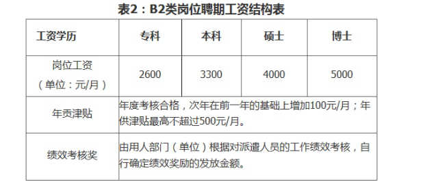 人才派遣聘用人员的人事关系属于人才派遣机构,岗位薪酬参照《浙江工业大学人才派遣制度实施办法》岗位标准,各种社会保险待遇按照有关规定缴纳。B2类岗位聘期工资包括岗位工资(税前,含个人承担的险金)、年贡津贴和绩效奖励,试用期工资按聘期工资标准的80%确定。具体如下: