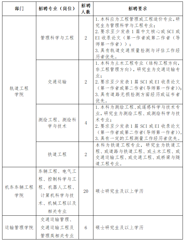学校现有专任教师近500名,副高级以上教师100余人,设有轨道工程学院、机车车辆工程学院、运输管理学院、信息工程学院、电气工程学院、装备制造工程学院、马克思主义学院、基础教学部、体育教学部、中专部等七院三部。现已形成以城市轨道交通运营管理、城市轨道交通车辆技术、城市轨道交通工程技术、铁道通信与信息化技术、铁道供电技术五个主干特色专业为主,空中乘务、大数据技术、物联网应用技术、电子商务等专业协调发展的专业格局。根据学校未来发展需要和师资队伍建设规划,现面向社会公开招聘专任教师岗、辅导员岗。