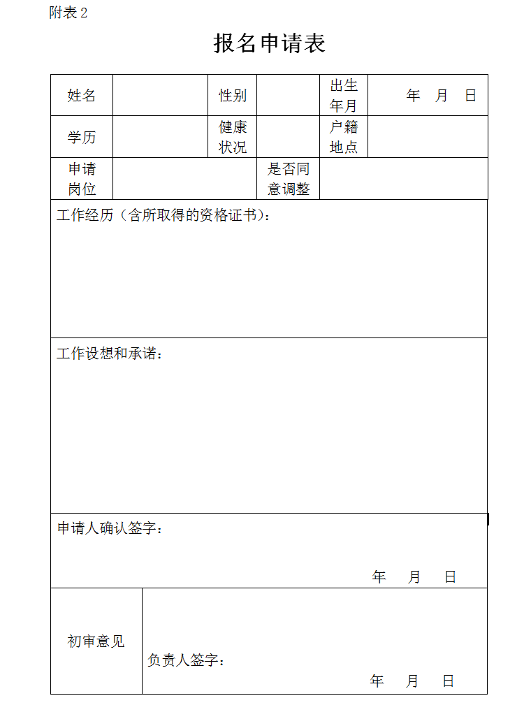 1.报名。请于2020年4月30日前将报名材料报送至人事教育处212房间。报名材料包括本人身份证复印件、当地公安机关开具的无违法违纪证明、县级及以上医院体检表(血压、心电图、血常规、胸透、心脏彩超等)、报名表(报名表见附表2)1份、个人简历(附学历资历材料复印件)5份。