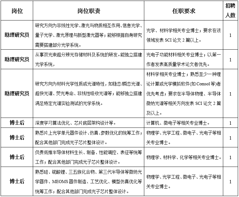 应聘者请将个人简历(含电子照片)E-mail发送中科院上海光机所人事处,电子邮件地址:zhaopin@siom.ac.cn。
