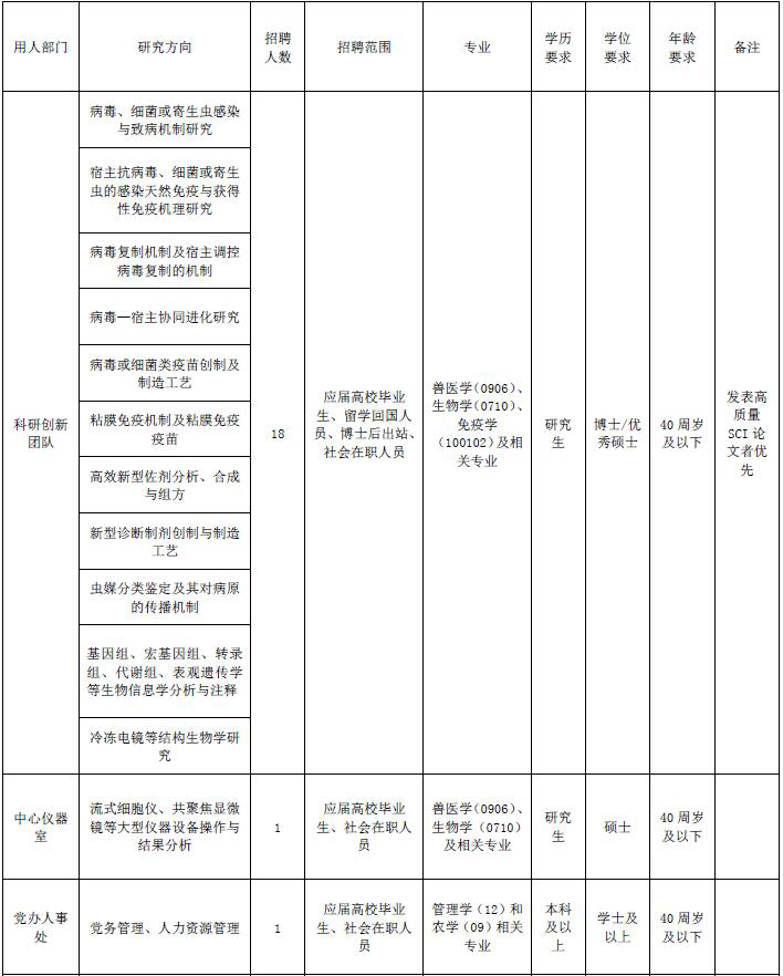 中国农业科学院兰州兽医研究所成立于1957年,是新中国成立以来最早设立在西北地区的综合性、公益性兽医科研机构。2006年1月经中编办批准,加挂“中国动物卫生与流行病学中心兰州分中心”牌子。研究所集动物病毒病、细菌病、寄生虫病及人兽共患病研究为一体,在口蹄疫、非洲猪瘟以及包虫病研究等方面具有独特优势,是国家生物安全体系和动物疫病防控体系的重要组成部分和关键技术支撑单位。根据学科发展和研究方向共设有10个创新团队,拥有家畜疫病病原生物学国家重点实验室等10个国家及省部级平台和P3级实验室、P3级大型和中型动物实验室以及GMP中试基地等基础设施。现根据工作需要拟面向社会公开招聘工作人员20名。