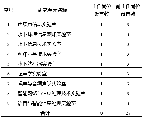 为深入贯彻习近平新时代中国特色社会主义思想和党的十九大以及十九届二中、三中、四中、五中全会精神,深入实施中国科学院“率先行动”计划,推进声学所科技创新发展,吸引和凝聚优秀人才,依据《党政领导干部选拔任用工作条例》《中国科学院研究所中层领导人员选拔聘用和管理实施办法》(科发党字〔2017〕25号)《中共中国科学院党组关于加强年轻干部队伍建设的意见》(科发党字〔2020〕18号)及《中国科学院声学研究所岗位管理实施细则》(声人字〔2017〕60号)等文件精神,结合声学所科技发展战略及实际情况,本着“按需设岗,按岗聘任,竞争择优,合同管理”和“公开、公平、公正”的原则,面向所内外公开招聘各研究单元负责人。
