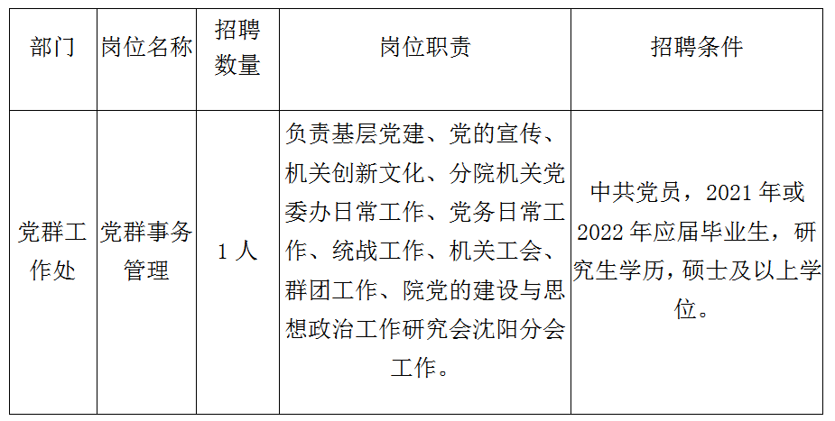 中国科学院沈阳分院是中国科学院的派出机构,属于事业单位,负责联络和协调中国科学院在辽宁省和山东省的研究所。本着“按需设岗、公开招聘、竞争上岗、择优聘用”的原则,面向系统各单位招聘管理岗位工作人员,具体信息如下: