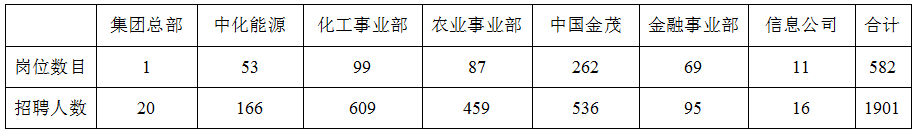 2021年中化集团将提供582个岗位,招聘共计1901人。