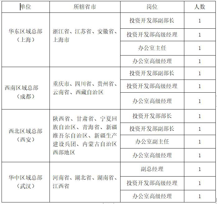 为推进集团公司“三年五年规划、十年三十年愿景目标”中长期发展战略,全面深化改革,创新管理体制,根据工作需要,拟公开招聘部分区域总部负责人及部门相关人员,现将有关事项公告如下: