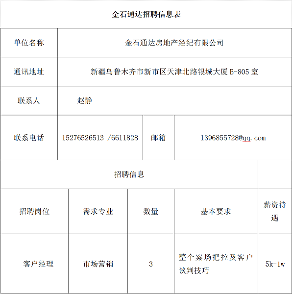 新疆金石通达房地产经纪有限公司成立于2013年,现在拥有员工人数480名,作为新疆不动产全程服务商。公司以诚信、稳健的经营理念,简单高效的发展方针,立志成为在乌鲁木齐房产代理行业的佼佼者。