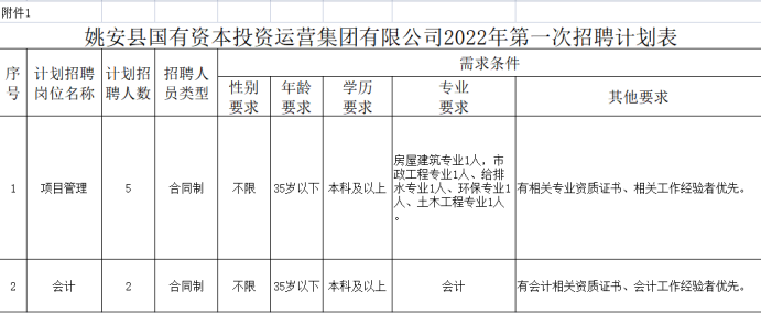 详见附件1:姚安县国有资本投资运营有限公司2022年第一次招聘计划表