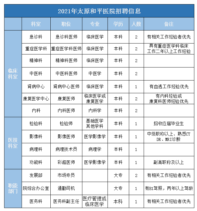 医院将在新的体制下,锐意创新改革,引进各类型人才,坚定“一体两翼”发展战略不动摇,努力将我院建设成为山西省知名的三级康复专科医院。现因病区扩张及业务持续快速发展的需要,现面向校园和社会广纳人才,我们热切地期待有识之士的加盟,医院将为您提供广阔的视野发展机遇和平台。
