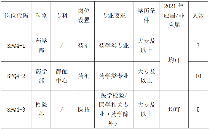 因工作需要,医院现面向社会公开招聘药学部药剂岗位17人,检验科医技岗位5人,现将有关事项公布如下: