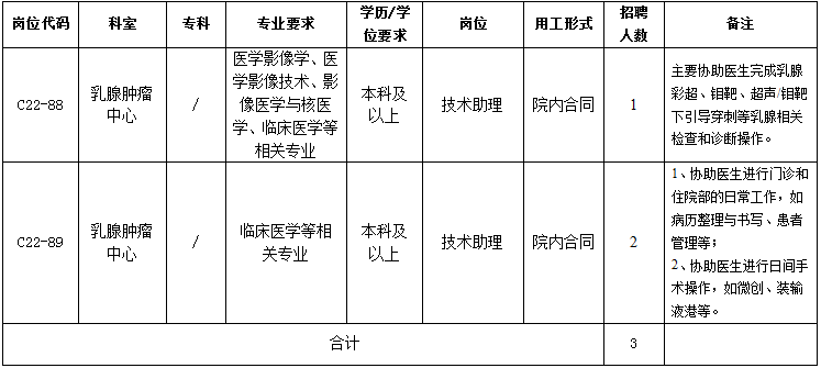 因乳腺肿瘤中心工作需要,面向社会公开招聘技术助理岗位3人,现将有关事项公布如下:
